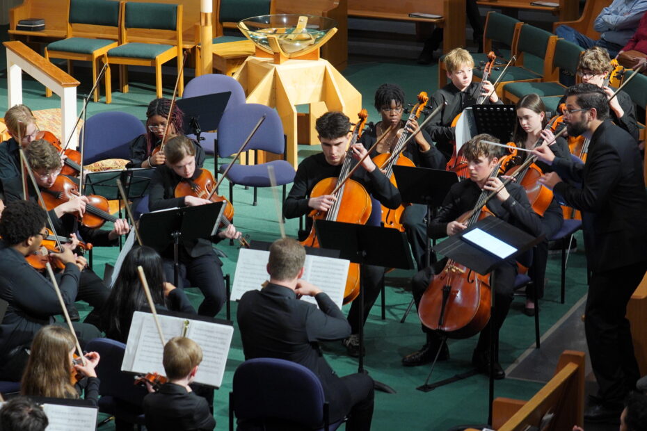 February 8, 2025 [Davidson, North Carolina] – NCYO began the concert at Davidson United Methodist Church with a captivating display of talent, as four chamber pieces set the tone for the evening. Chamber music is played by a small ensemble, with one musician to a part. The concert featured Duet # 4 from 12 Duets for Violin and Viola by Robert Fuchs performed by James Welsh (violin) and Ella Kuzara (viola), A Winter’s Willow by Ralph Vaughan Williams performed by Trey Parrish (flute), Aiden Natal (clarinet), and Tallulah Wafer (bassoon), Tango from España by Isaac Albéniz performed by DeAndra Molina (flute), Owen Hoopes (clarinet), and Tallulah Wafer (bassoon), and Andante Melodique, OP. 214 by Charles Dancia performed by Jacob Pecoraro (violin), Tristan Thompson (cello), and Anya White (piano). Audience members enjoyed Poet and Peasant Overture by Franz von Suppé as the orchestra came together to close out the evening.