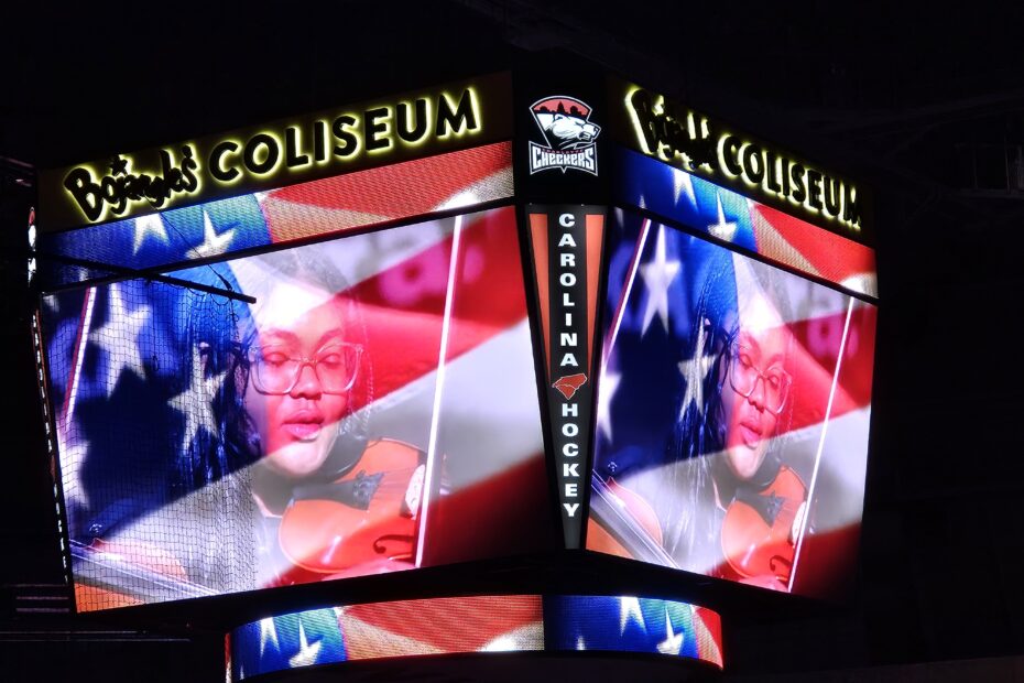 February 22, 2025 [Charlotte, North Carolina] – The North Carolina Youth Orchestra performed the national anthem at the Charlotte Checkers game on Saturday in front of a record breaking crowd. Checkers announcers said 8,665 people were in attendance, their biggest crowd to date. Hockey stood with hands over hearts as students skillfully performed The Star Spangled Banner fans cheered as the last strains rang out and the puck dropped.