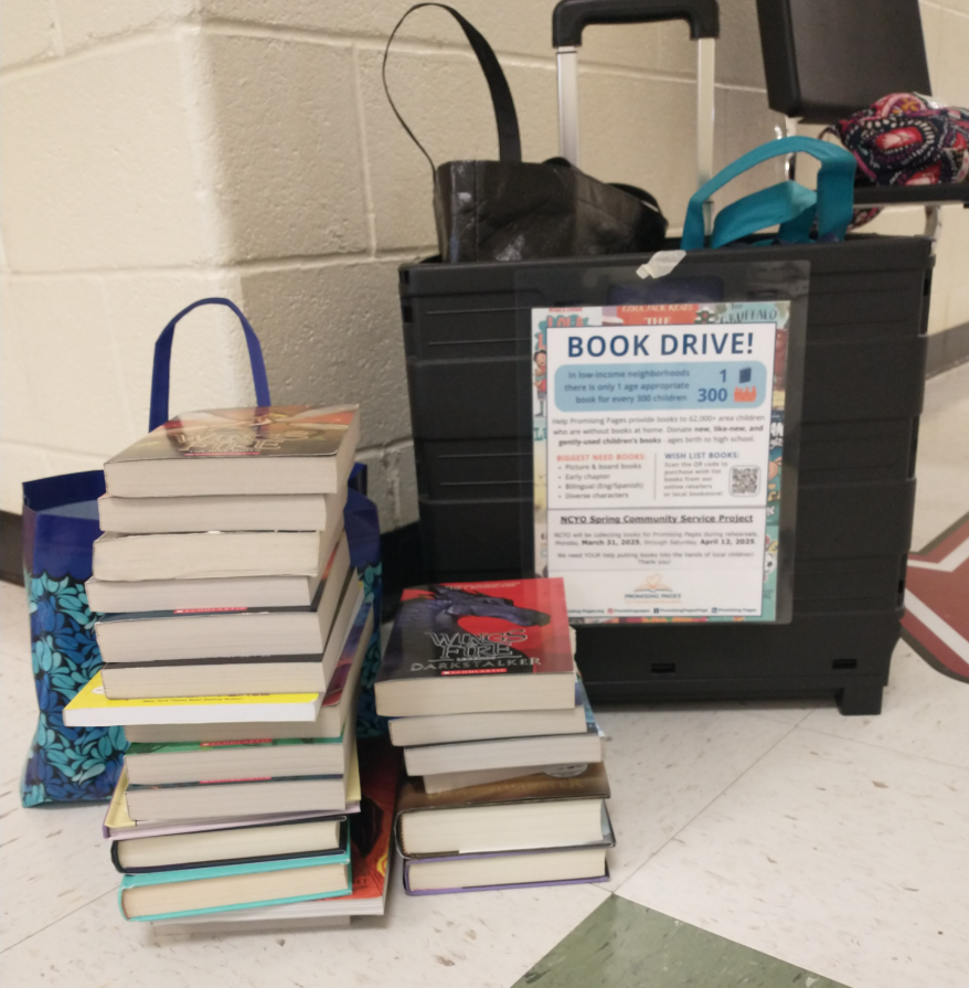 April 17, 2025 [Charlotte, North Carolina] – Throughout the month of April, NCYO students and parents came together to collect books for Promising Pages, an organization dedicated to giving local children access to books in Charlotte. According to their website, “an estimated 60,000 children in Charlotte are living in a book desert,” and “Home libraries are often seen as a luxury for under-resourced families” in the community. NCYO collected 295 new and gently loved books aimed at children from birth to high school and delivered them to Dana Powell, Operations Manager at Promising Pages.