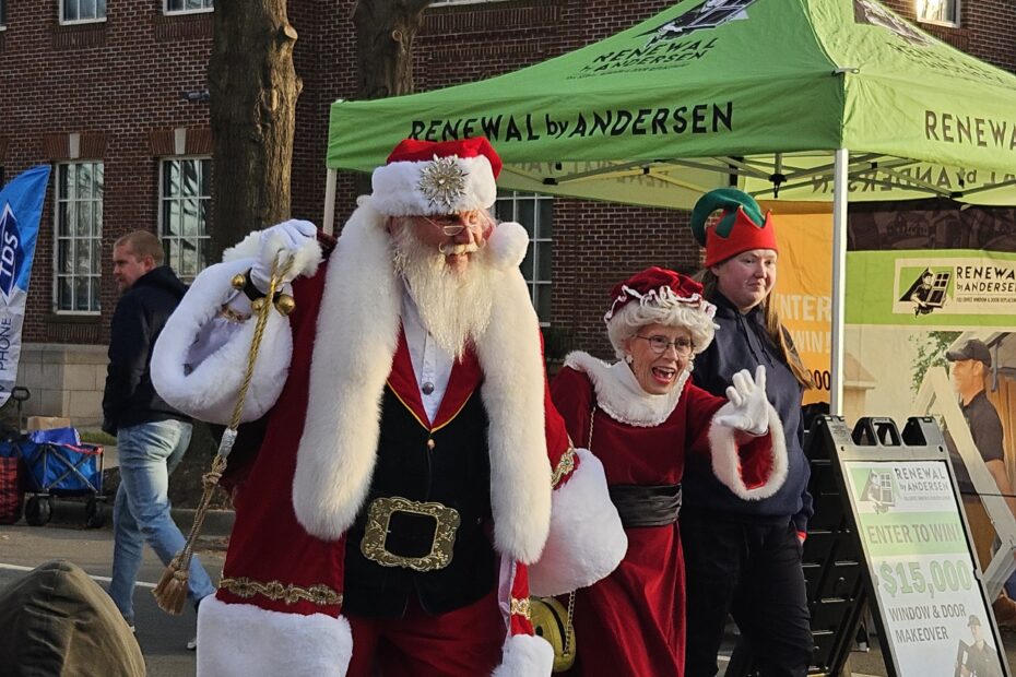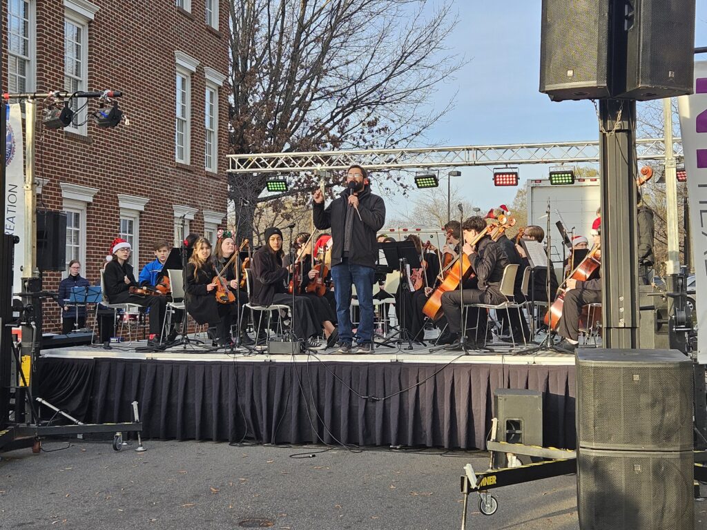 November 29, 2025 [Cornelius, North Carolina] – Members of NCYO’s Orchestra and Philhamonic braved the cold to welcome Santa, entertain festival goers, and ring in the holiday season as the opening act at Light Up Cornelius. The two ensembles came together to present classics such as Christmas with the Nutcracker, Sleigh Ride, Rudolph the Red Nose Reindeer, and Christmas Sing-a-Long Medley featuring hymns such as O Come All Ye Faithful, Silent Night, and more. Festival goers even learned a little Christmas music history. The ensemble performed The Christmas Waltz, which was written for singer Frank Sinatra in 1954 and was the first Christmas waltz written. A waltz is a song written in 3/4 time, said NCYO director Eric Boruff. Midway through the performance Santa and Mrs. Claus arrive in style in two Cornelius firetrucks. The pair were the epitome of holiday spirit dressed in their iconic matching red velvet and white fur trimmed suit and dress, respectively. Following NCYO’s performance, merry makers were treated to a tree lighting, pictures with Santa, and more.