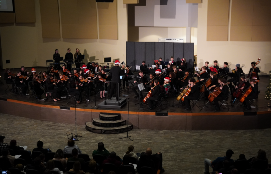 Woodwind Ensemble captured the audience’s attention with a unique piece called “House of the Rising Bells”. This arrangement by Tyler Arcari combines two well known folk tunes “House of the Rising Sun” and “Ukrainian Bell Carol”. No holiday season is complete without curling up on the couch to enjoy some Christmas movies. Woodwind Ensemble brought two of these movies to life with their performances of Music from Frozen and “The Polar Express”. Junior Woodwind Ensemble then took their places on stage for a combined performance of the classic Christmas tunes “Jingle Bells” and “Rudolph The Red-Nosed Reindeer”.