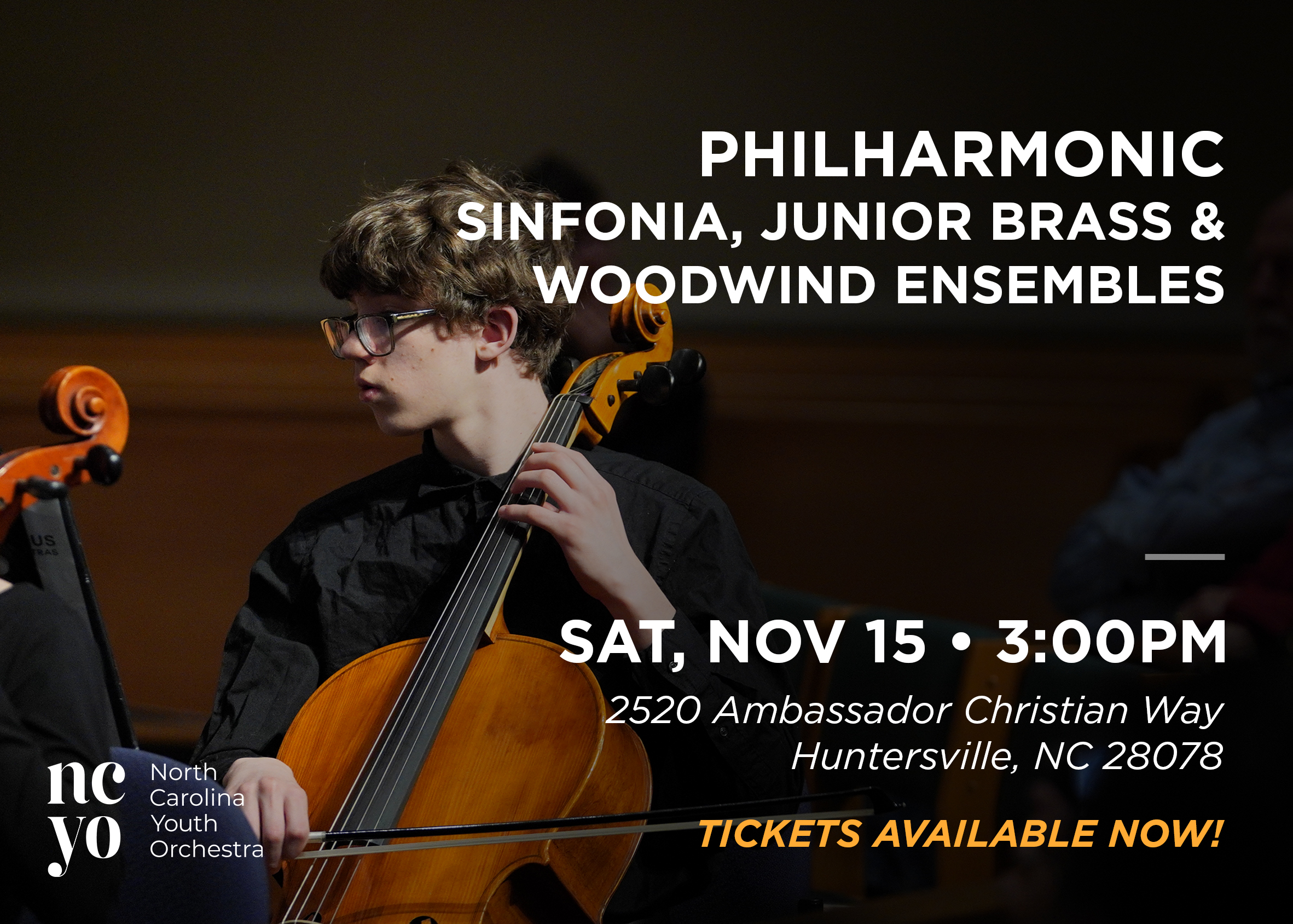 Kannapolis Middle School Auditorium 1000 Virginia Dare St, Kannapolis, NC, United StatesYou won't want to miss the NCYO's Season Finale concert featuring ALL of the NCYO's performing ensembles: Orchestra, Philharmonic, Brass Ensemble, Junior Brass Ensemble, and Woodwind Ensemble. Grab your tickets… Read More »Concert // All Performing Ensembles